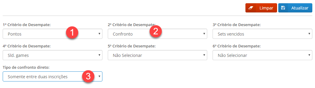 O administrador do torneio deverá verificar o critério selecionado e analisar os atributos de desempate utilizado pelo sistema. Para maiores informações, clique AQUI e visualize com maiores detalhes como funciona o desempate para mais de dois tenistas.